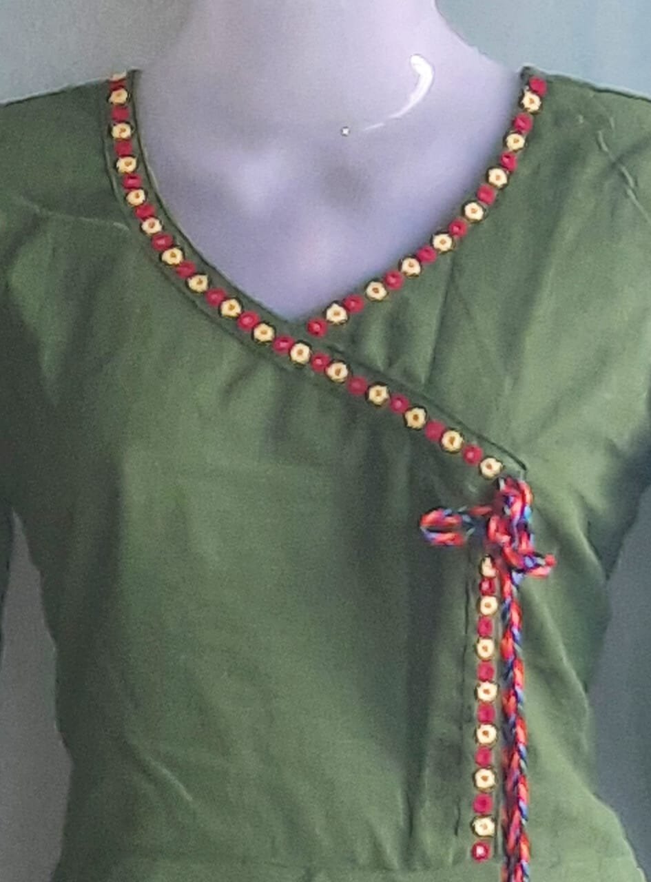 Bottle Green Angarkha Style Anarkali Cotton Kurti with Mirror Work.