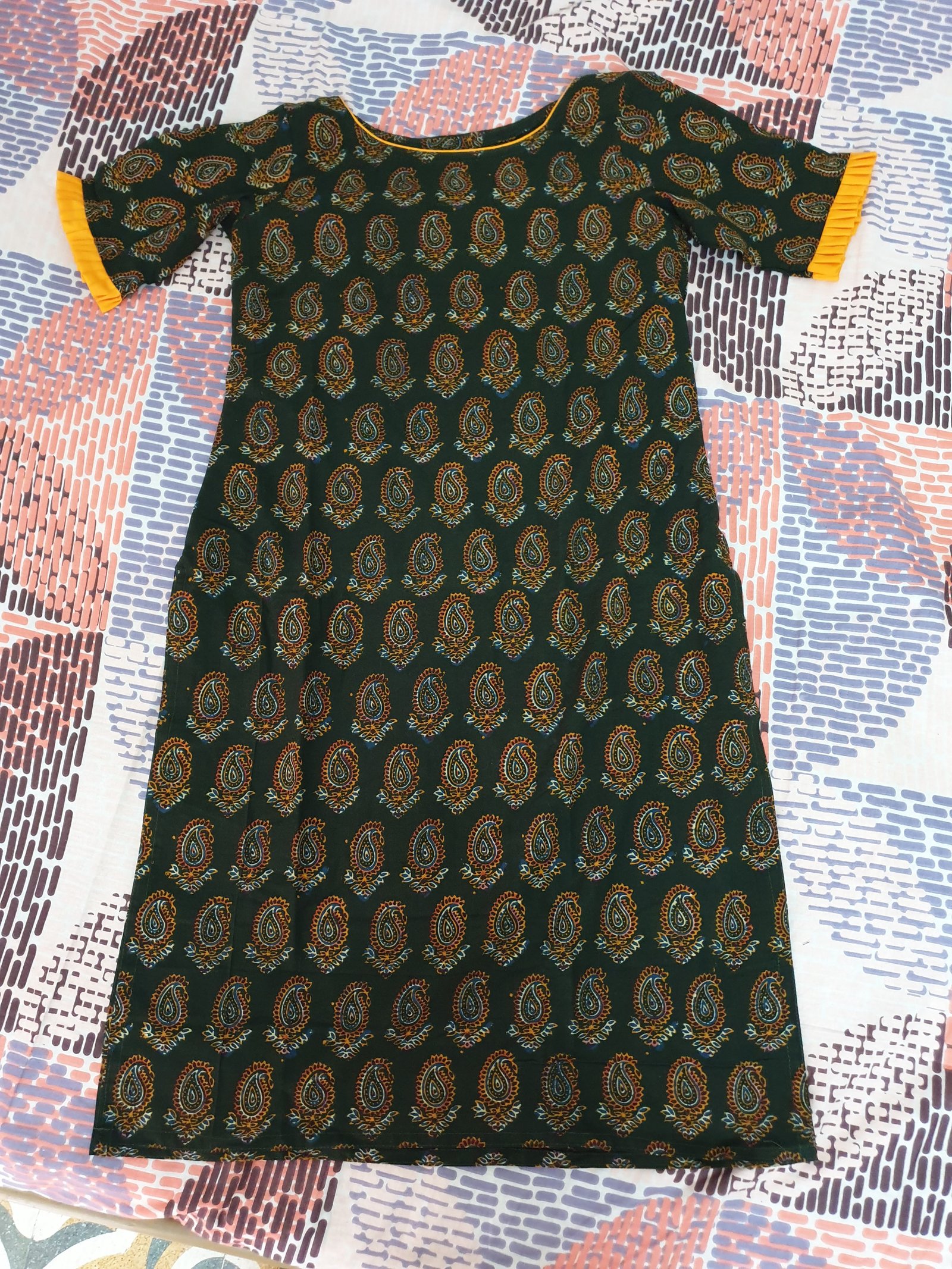 Bottle Green Cotton Straight Printed Kurti with Bottle Neck.