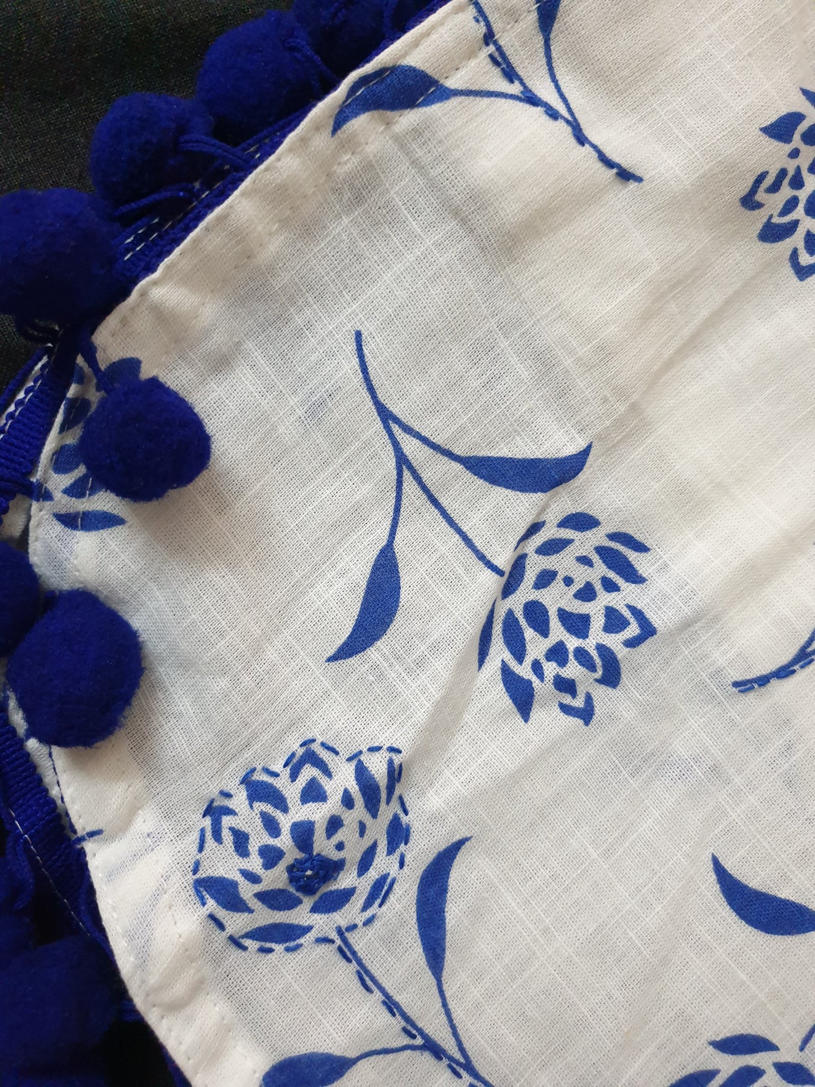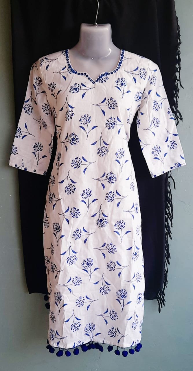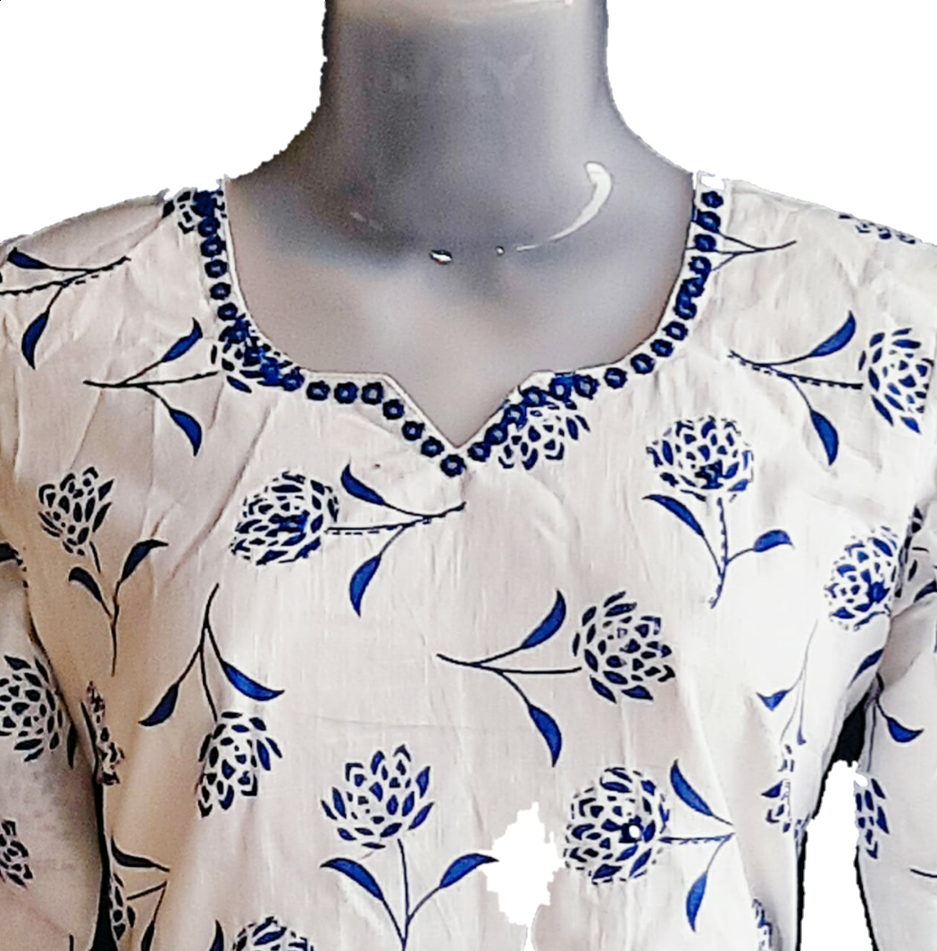 White and Blue Cotton Kurti with Front Mirror Work AndTussel..
