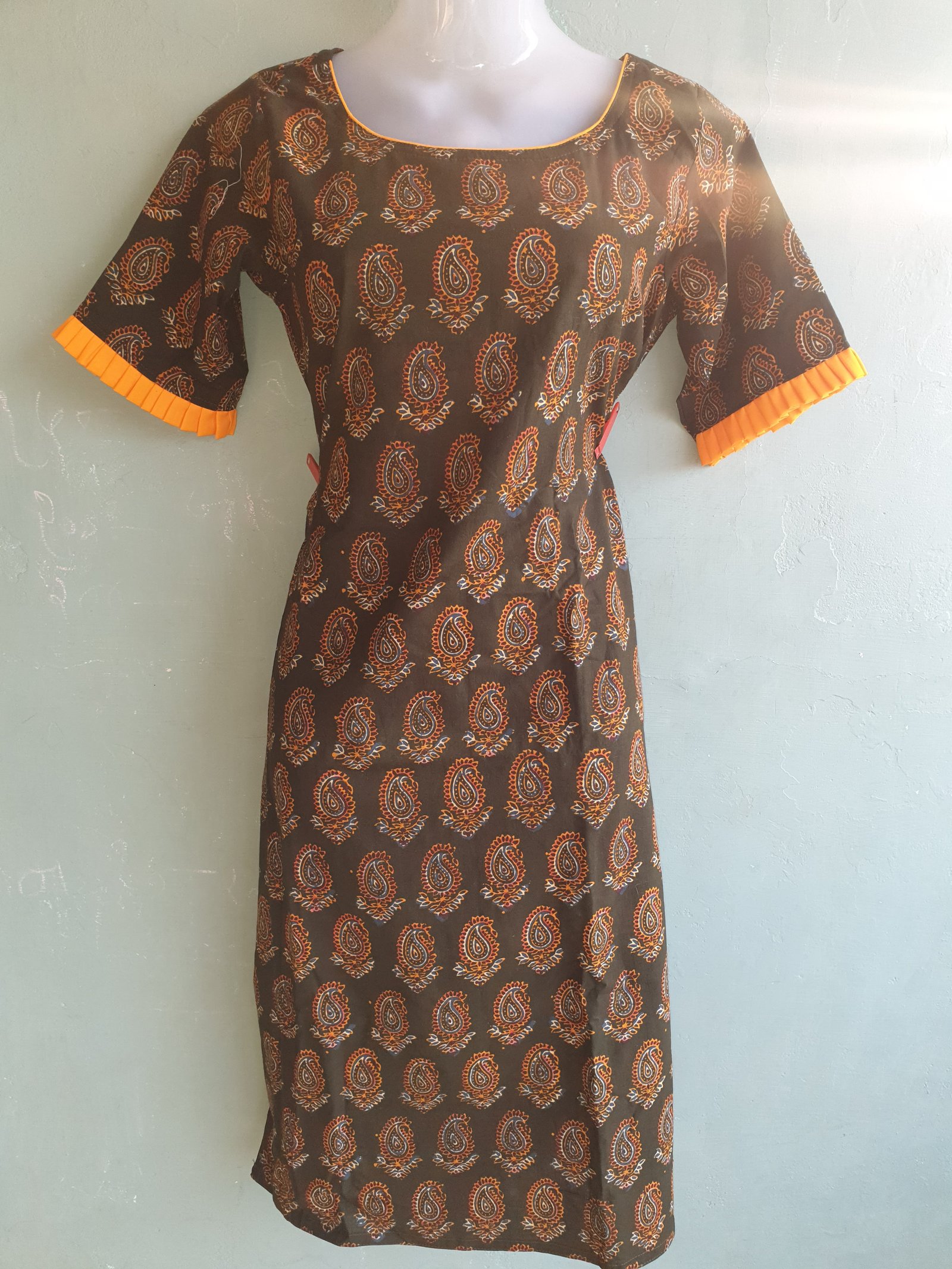 Bottle Green Cotton Straight Printed Kurti with Bottle Neck.
