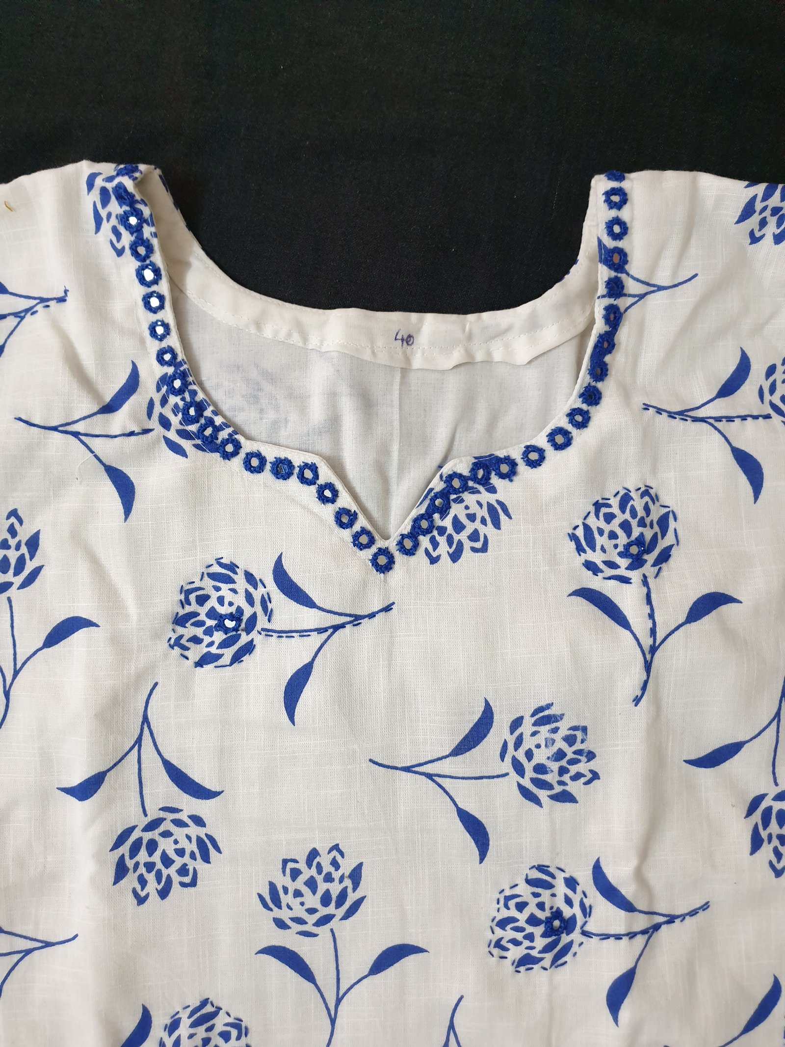 White and Blue Cotton Kurti with Front Mirror Work AndTussel..